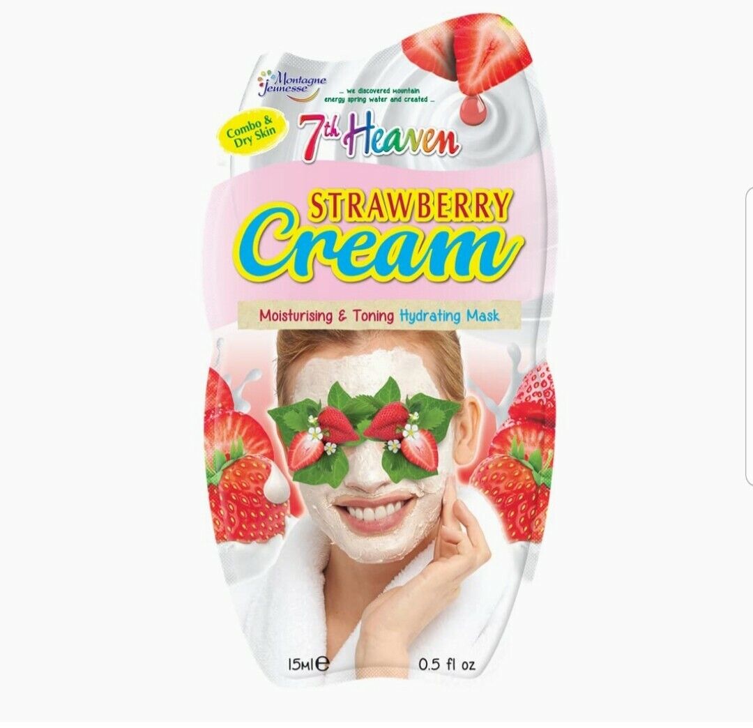 7th Heaven STRAWBERRY CREAM moisturing & toning hydrating mask 15ml (combo & dry.7th Heaven Strawberry Souffle face Masque 15ml what sounds more like heaven than skin freshening strawberries and moisture rich cream? We mixed our hydrating toning mask with juicy Aloe to give you a super soft and glowing complexion. Quench your skin's thirst regularly to rehydrated and freshen. 7th Heaven Natural strawberry Souffle moisturising and purifying Masque with pulped strawberries and whipped cream. Loaded with strawberry goodness which leaves skin hydrated and refreshed. Allow your skin to breathe with soothing Aloe Vera and calming vanilla. Cleanse with this treat Weekly.