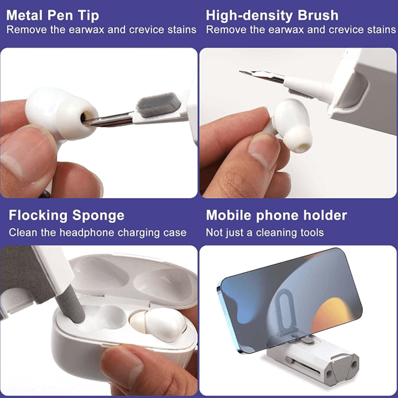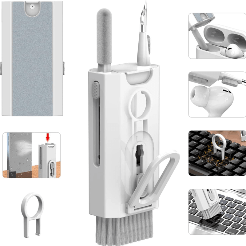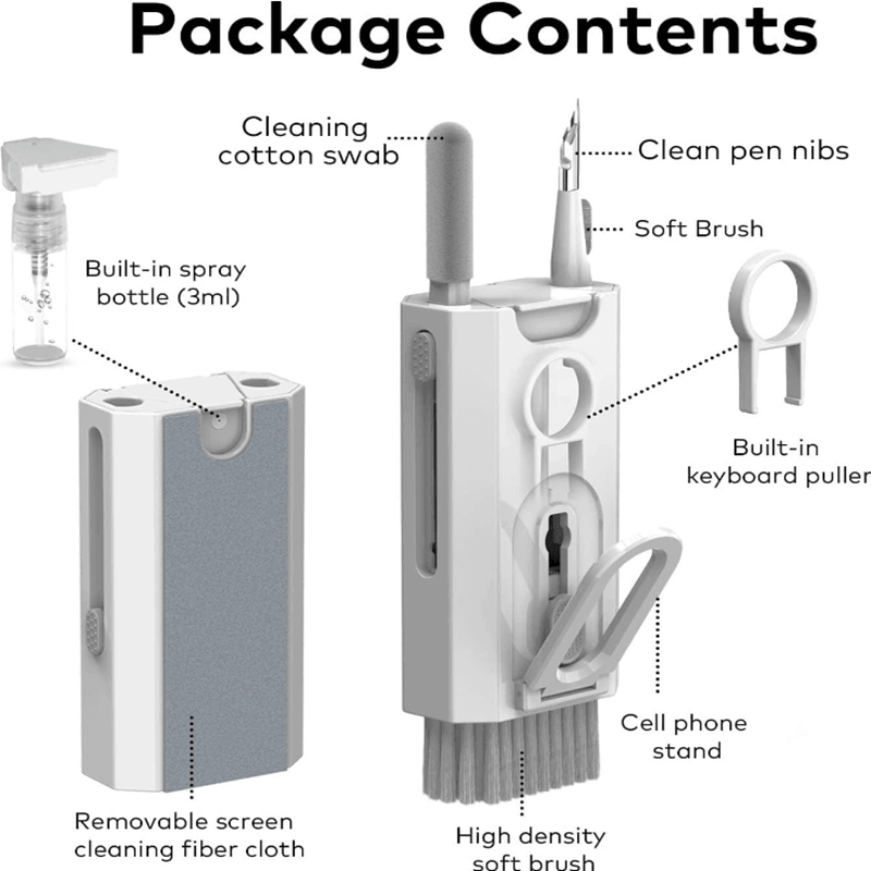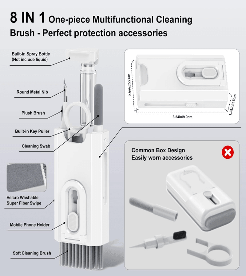 All in one design -- 8 in 1 multifunctional cleaning kit, keyboard/headset/mobile phone/cleaning in a powerful cleaning kit, with a mechanical keyboard squeegee, a cleaning pen, a plush cleaning cloth, a nylon brush and a phone stand - the portable cleaning kit you have always wanted. Headset/mobile phone cleaning kit -- the flocked sponge brush removes dust from the headset and the wireless charging case. The metal tip cleans headphones and phone openings from dust, and the high-density brush frees the sound output of the headphones from dirt. The included phone holder helps you keep your phone in place Keyboard / screen cleaning set -- pour water into the mini spray bottle (empty), spray a suitable amount of cleaning solution on the screen and wipe the screen with the screen cloth to achieve efficient cleaning. Use the keycap puller to easily remove the keycaps and clean the keyboard. Compatibility -- regular cleaning of your electronic devices helps to extend their lifespan, compatible with Airpods, wireless Bluetooth headsets, wired gaming headsets, mobile phones, keyboards, cameras, laptops Perfect Gift --The 8-in-1 keyboard cleaning brush set is the perfect gift for digital enthusiasts and an indispensable computer accessory for any occasion. It helps to clean mobile phones and Bluetooth headsets quickly and efficiently.