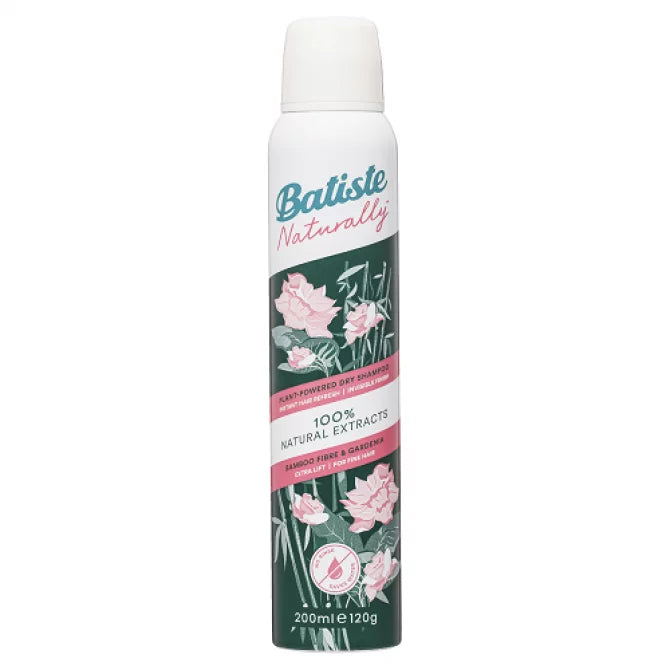 Batiste Naturally dry shampoo with 100% natural bamboo fibre & gardenia extract gives an extra lift for fine hair.