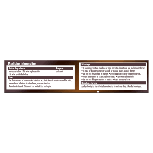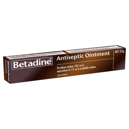 Betadine Antiseptic Ointment is recommended for the treatment of common skin infections such as infected skin around the nails and tinea, as well as preventing infection in minor burns, cuts and abrasions. It is a bacterial, sporicidal and fungicidal antiseptic.