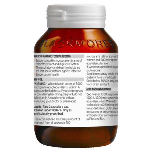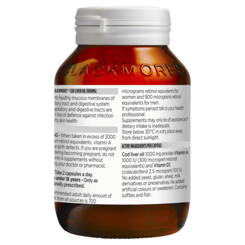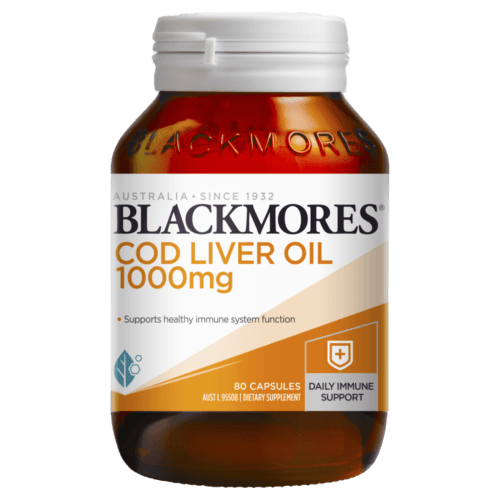 Blackmores Cod Liver Oil 1000mg is a source of vitamins A and D and omega-3 fatty acids. Vitamin A helps to support a healthy immune system, and vitamin D is essential for calcium absorption.