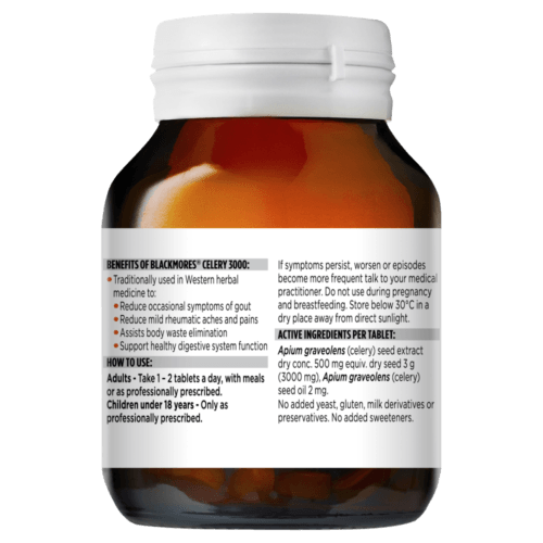 Blackmores Celery 3000 contains celery and celery seed oil which help relieve the symptoms of mild gout, rheumatism and mild arthritis.