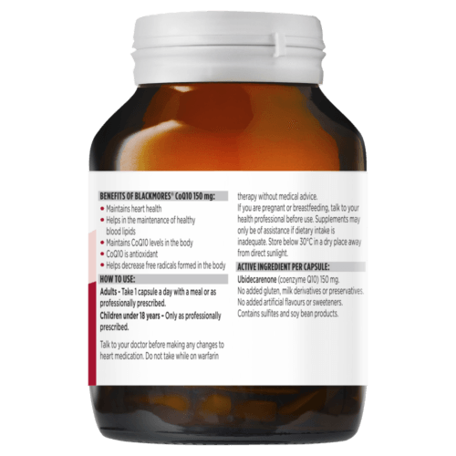 Blackmores CoQ10 150mg contains coenzyme Q10 (CoQ10), an antioxidant which maintains heart health and promotes blood vessel health.