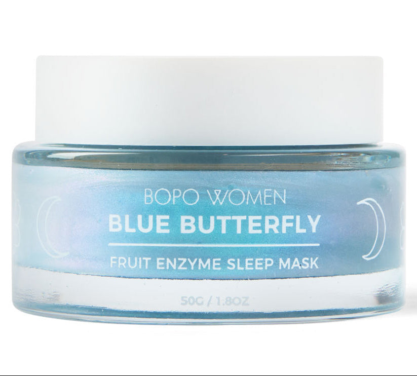 Discover the magic of our Blue Butterfly Enzyme Sleep Mask, designed to work overnight while you rest. This luxurious mask harnesses the power of natural ingredients to exfoliate, hydrate and rejuvenate your skin, leaving it radiant and refreshed by morning. It's more than just a mask - it's a nightly ritual for glowing, healthy skin. A natural AHA/BHA fruit enzyme blend of bilberry fruit, willow bark, sugar maple and lemon brightens and exfoliates, while sugar beet and sodium hyaluronate hydrate and promote cell regeneration. With a sleep-inducing essential oil blend of sweet orange, rose and chamomile oil, it’s the mask that happy dreams and skin are made from. Comes with a complimentary Bopo Women mask brush.