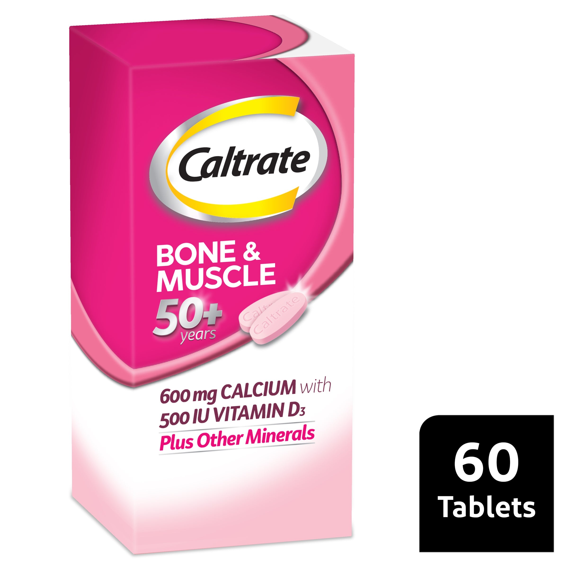 Caltrate Bone & Muscle 50+ is specially formulated to support the bone health needs of people over 50 years with an increased daily dose of calcium, compared to Caltrate Bone & Muscle. Caltrate Bone & Muscle also contains 4 other minerals to support healthy bones.