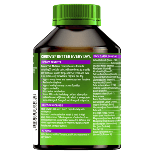 Cenovis® 50+ Multi is a comprehensive formula containing 27 specially selected ingredients to provide daily nutritional support for people 50 years and over, in one no fuss, easy to swallow capsule per day.