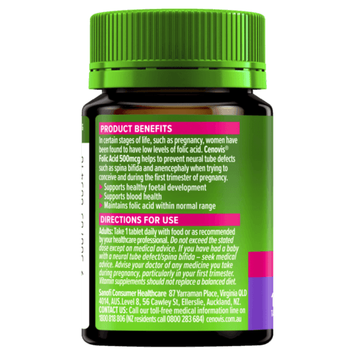 Cenovis Folic Acid 500mcg may be taken as part of a healthy supplementation routine daily prior to conception and during pregnancy, to help reduce the risk of having a child with spina bifida or neural tube defects. Folic acid is needed for the synthesis of DNA and there is an increased requirement for folic acid during pregnancy. Adequate folic acid intake also helps maintain a healthy cardiovascular system and supports brain health.
