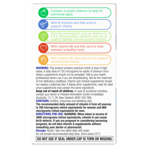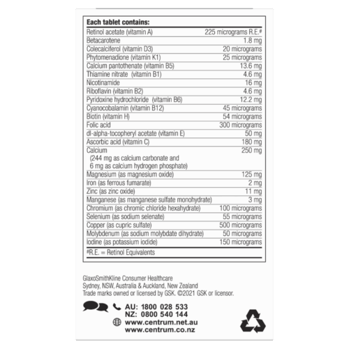 Retinol Acetate (Vitamin A) 225 micrograms R.E. (Retinol Equivalents), Betacarotene 1.8mg, Colecalciferol (Vitamin D3) 20 micrograms, Phytomenadione (Vitamin K1) 25 micrograms, Calcium Pantothenate 13.6mg (equiv. Pantothenic acid 12.5mg), Thiamine Nitrate (Vitamin B1) 4.6mg, Nicotinamide 16mg, Riboflavin (Vitamin B2) 4.6mg, Pyridoxine Hydrochloride (Vitamin B6) 12.2mg, Cyanocobalamin (Vitamin B12) 45 micrograms, Biotin (Vitamin H) 54 micrograms, Folic Acid 300 micrograms, dl-alpha-Tocopheryl Acetate (Vitamin E) 50mg, Ascorbic Acid (Vitamin C) 180mg, Calcium (244mg as Calcium Carbonate and 6mg as Calcium Hydrogen Phosphate) 250mg, Magnesium (as Magnesium Oxide) 125mg, Iron (as Ferrous Fumarate) 2mg, Zinc (as Zinc Oxide) 11mg, Manganese (as Manganese Sulfate Monohydrate) 3mg, Chromium (as Chromic Chloride Hexahydrate) 100 micrograms, Selenium (as Sodium Selenate) 55 micrograms, Copper (as Cupric Sulfate) 500 micrograms, Molybdenum (as Sodium Molybdate Dihydrate) 50 micrograms, Iodine (as Potassium Iodide) 150 micrograms.