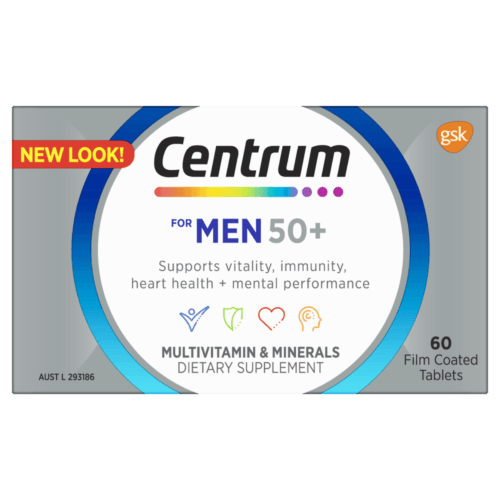 Centrum For Men 50+ multivitamin and minerals are complete from A to Zinc and support vitality, mental performance, immunity and heart health.