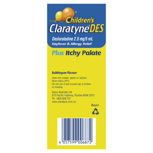 Children's ClaratyneDES Syrup provides rapid, non-drowsy relief for hayfever, year-round allergies and hives.