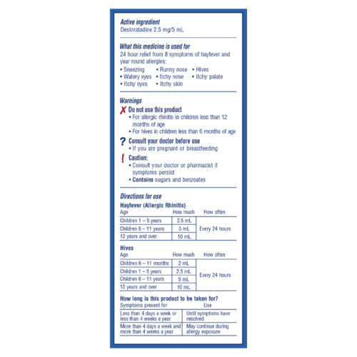 Children's ClaratyneDES Syrup provides rapid, non-drowsy, 24 hour relief for hives in children from 6 months of age and hayfever and year-round allergies in children 12 months and over. A single dose of Children's ClaratyneDES Syrup provides 24 hours of relief from: