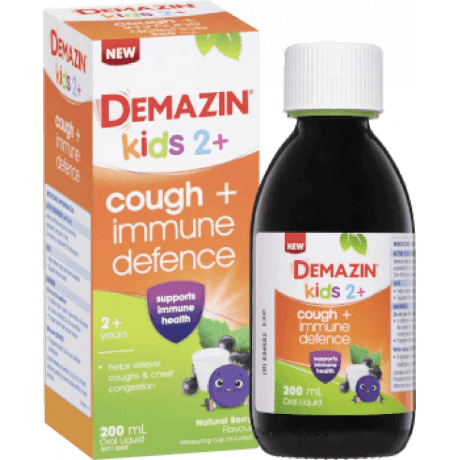 Demazin Kids 2+ Cough + Immune Defence Oral Liquid which helps to relieve: