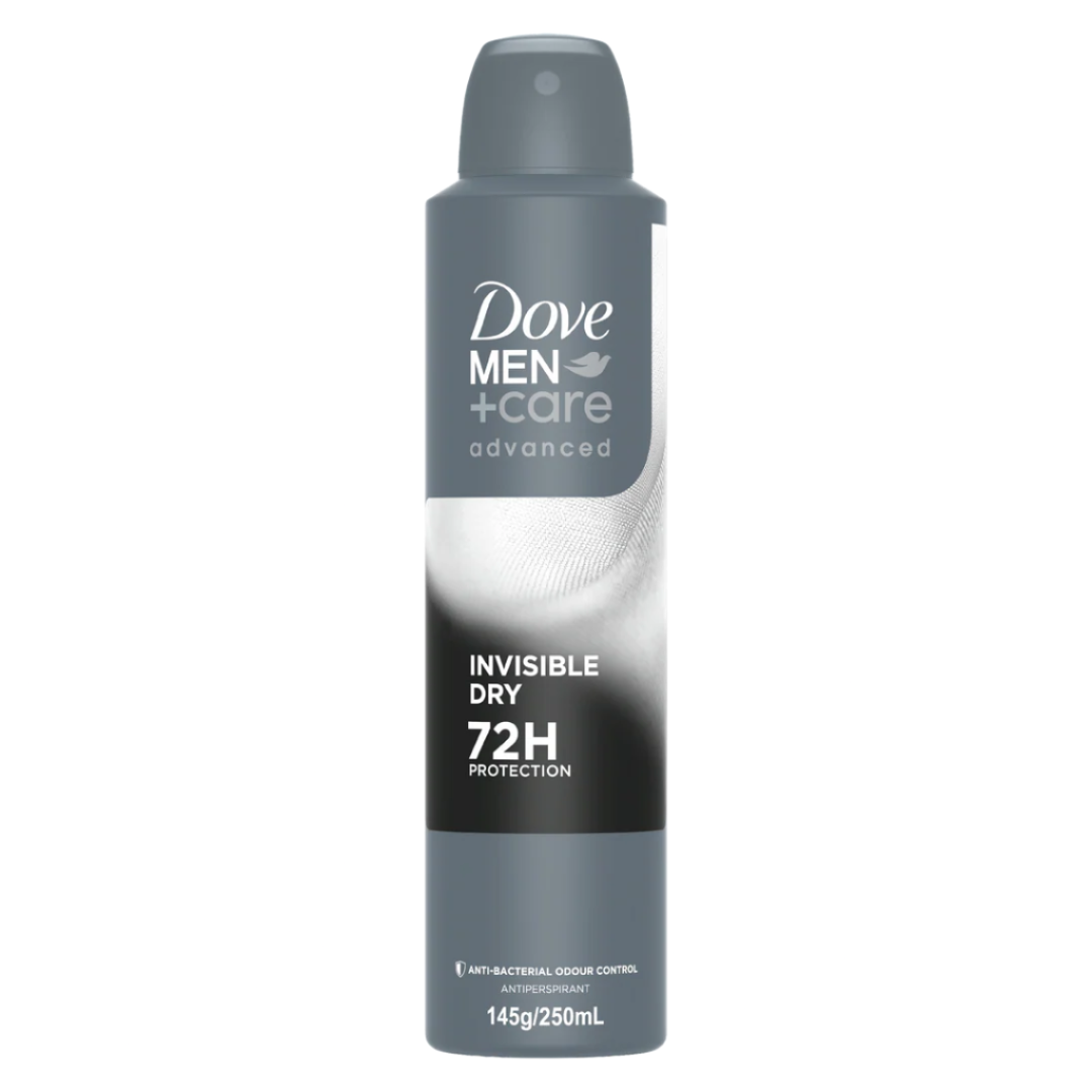 Engineered specifically for men, Dove Men+Care Advanced Invisible Dry Antiperspirant Aerosol uses Triple Action Technology to deliver 72 hours of powerful odour and sweat protection. Its non-irritant, alcohol-free* formula contains ¼ moisturising cream to strengthen your skin against underarm rash and chafing, keeping your underarms comfortable all day. Tough on sweat, not on skin, this antiperspirant deodorant leaves a fresh scent that will keep you feeling clean for longer. With complete protection and advanced care, you’ll get the increased confidence you need to feel your best all day. Dove Men+Care does not test on animals anywhere in the world, and our Invisible Dry Antiperspirant Aerosol is PETA-Approved Vegan.