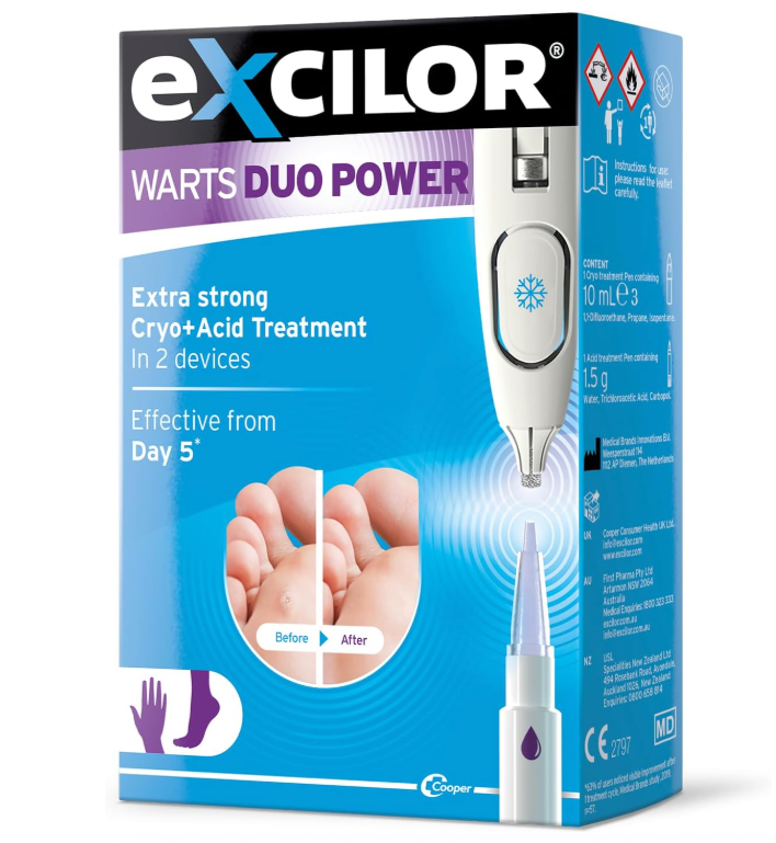 Excilor Warts DUO POWER has revolutionized the way to remove warts, making it easy to eliminate them from the comfort of your own home or on the go. Combining the power of cryotherapy with a gel acid formula, delivering effective results in just 5 days.