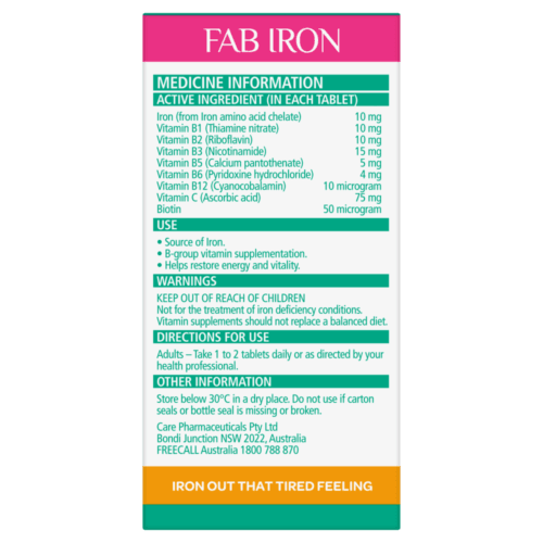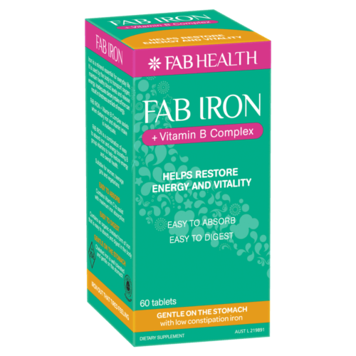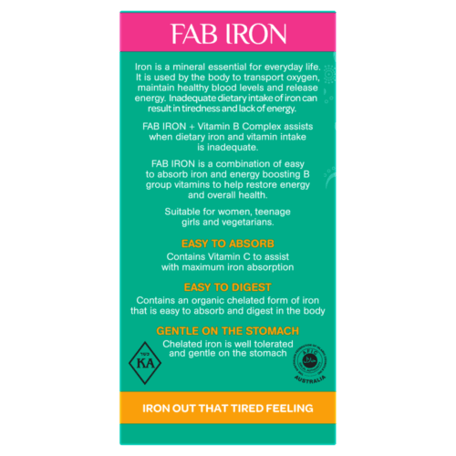 Fab Iron + Vitamin B Complex offers a combination of easy-to-absorb iron that is gentle on the stomach and energy boosting B group vitamins.