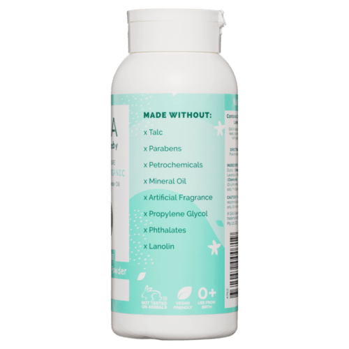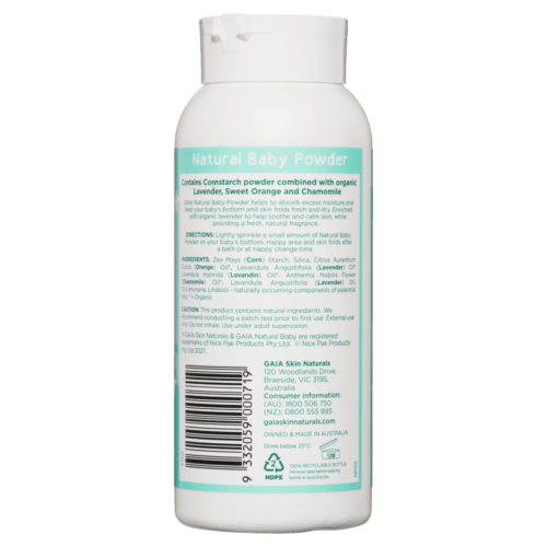 Lightly sprinkle a small amount of GAIA Natural Baby Powder on your baby's bottom, nappy area and skin folds either after a bath or at nappy change time.