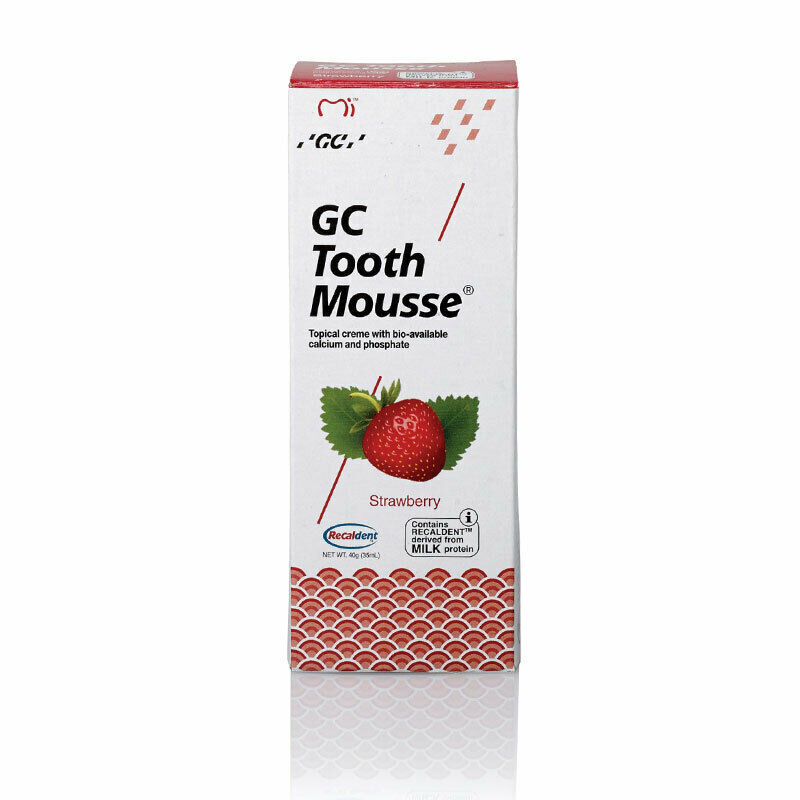 GC Tooth Mousse® is a delicious tasting crème that contains calcium and phosphate; the major minerals teeth are made from. Because calcium and phosphate are carried in a special milk-derived protein called RECALDENT® (CPP-ACP), they are available in a soluble form. This means GC Tooth Mousse® provides extra protection for teeth, buffers dental plaque acid from bacteria in the mouth and also protects teeth from acidic foods and drinks.