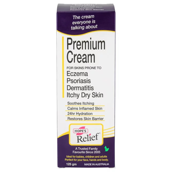 Hope’s Relief Premium Cream 60g is our #1 formula for itchy dry skins and skins prone to Eczema, Psoriasis, and Dermatitis.