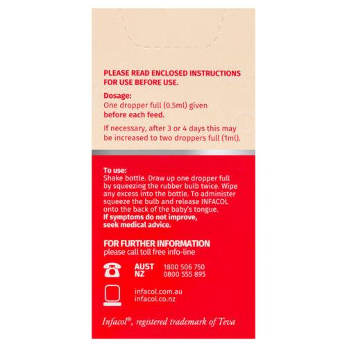 Directions Shake bottle. Draw up one dropper full by squeezing the rubber bulb twice. Wipe any excess into the bottle. To administer squeeze the bulb and release Infacol onto the back of the baby’s tongue.