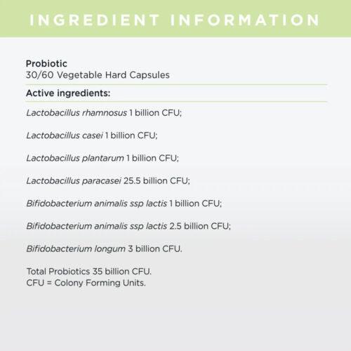 Each hard capsule contains: Lactobacillus rhamnosus (PA-LR12) 1 billion CFU, Lactobacillus casei (Lc-11) 1 billion CFU, Lactobacillus plantarum (LA-PL10) 1 billion CFU, Lactobacillus paracasei (LPC-37) 25.5 billion CFU, Bifidobacterium lactis (Bb-12) 1 billion CFU, HOWARU Bifidobacterium animalis ssp lactis (HN019) 2.5 billion, Bifidobacterium longum (BB536) 3 billion. Total probiotics 35 billion CFU. CFU, Colony Forming Units.