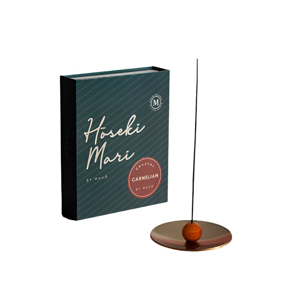 Crafted with intention, the Hōseki Mari by MAHŌ combines a hand-forged solid brass dish with a radiant semi-precious Carnelian sphere, offering an elevated and ethereal incense-burning experience.