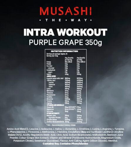 MUSASHI Intra-Workout is a scientifically formulated high performance drink that contains a matrix of Branched Chain Amino acids (BCAAs), Essential amino acids (EAAs), with Glutamine and Citrulline, as well as vitamins and minerals including magnesium to support muscle protein synthesis. Designed for intra-workout consumption, this advanced formulation is designed specifically to meet the needs of athletes whether competing on the field or working out on the gym floor. Easy mixability, a delicious taste and high strength ingredients act as an intra-workout catalyst to take your game or gym session to the next level.