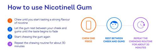 To get the most benefit from Nicotinell Gum, it is important to chew properly. The illustration shows how to do this. Remember, taking breaks between chewing is essential. If more nicotine is released than your mouth is able to absorb, you’ll end up swallowing it and not feeling the effects. Please read the leaflet enclosed in the pack and make sure you follow the instructions carefully.