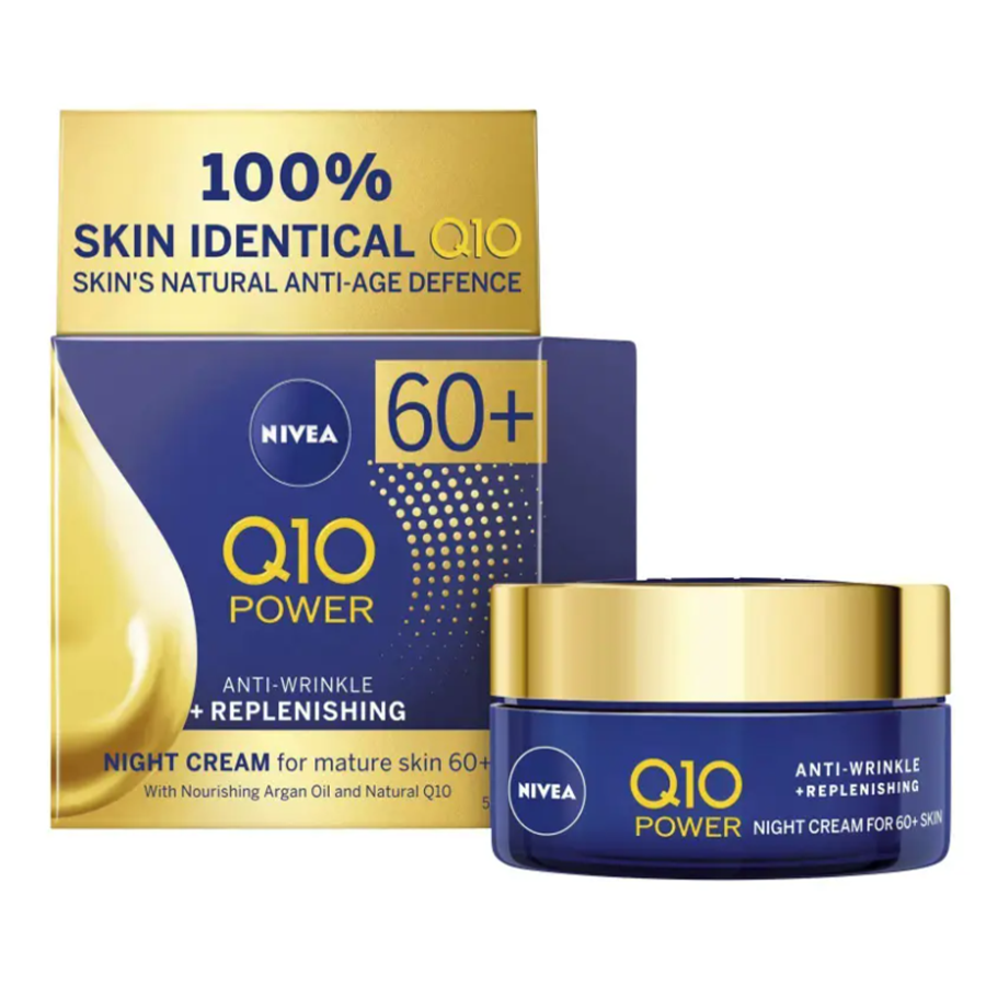 Nivea Q10 Power Anti Wrinkle + Replenishing Night Cream for Mature Skin contains Q10 which is 100percent skin identical to what is found in your skin. Gained by a natural-yeast fermentation process, this pure and natural quality of Q10 works in perfect harmony within your skin. Nivea Q10 Power Anti Wrinkle + Replenishing Night Cream for Mature Skin is specially formulated to suit the specific needs of 60+ skin. This anti-wrinkle night cream helps replenish levels of Q10 in the skin, protecting from dryness and reducing the visible signs of ageing.