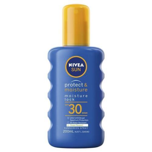 NIVEA SUN Protect & Moisture Moisture Lock SPF30+ Sunscreen Spray cares for you and the oceans in more ways than one with 5+1 protection. With broad spectrum protection and a moisturising formula, this sunscreen protects you from harmful UV rays whilst nourishing your skin. With the use of NIVEA SUN Protect & Moisture Moisture Lock SPF30+ Sunscreen Spray you can expect UVA & UVB protection against skin ageing and sunburn, plus 4 hour water resistance. It has a moisturising formula with Panthenol and Vitamin E to help protect the skin from the drying effects of the sun and is dermatologically tested. Made in Australia.