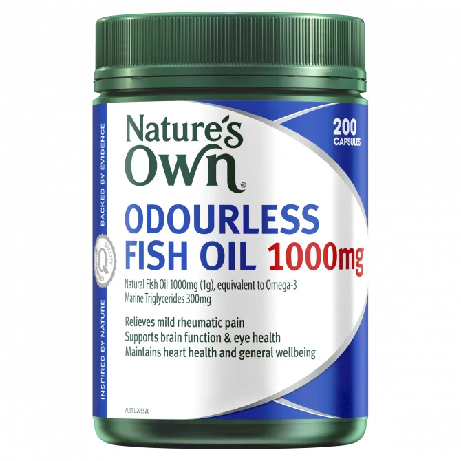 Nature’s Own Odourless Fish Oil 1000mg is a natural source of Omega 3 essential fatty acids, with an odourless formula to reduce fishy aftertaste and reflux. Omega 3 is important for the maintenance of general health and wellbeing, as well as for heart, brain and joint health.