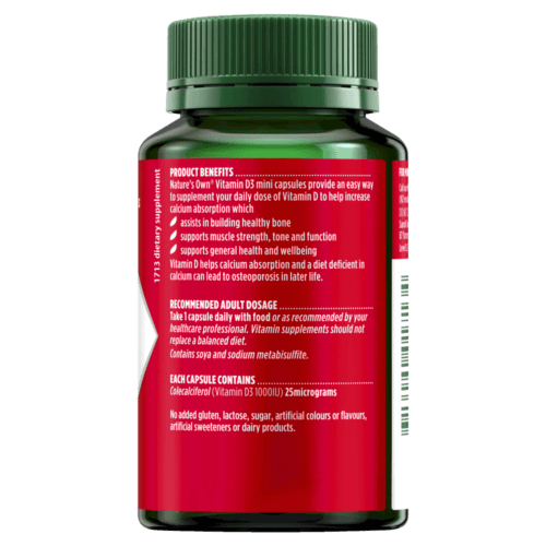 Nature’s Own Vitamin D3 mini capsules provide an easy way to supplement your daily dose of Vitamin D.