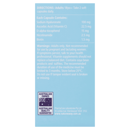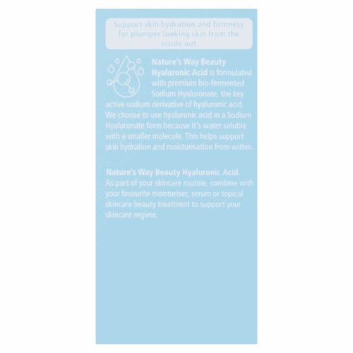 If you want moisturisation and firmness that is more than skin deep, Nature’s Way Beauty Hyaluronic Acid supports water-locking hydration beneath the skin surface. Quench your skin from the inside out for beautiful skin from within. Nature's Way Beauty Hyaluronic Acid is formulated with premium bio-fermented Sodium Hyaluronate, the key active derivative of hyaluronic acid.