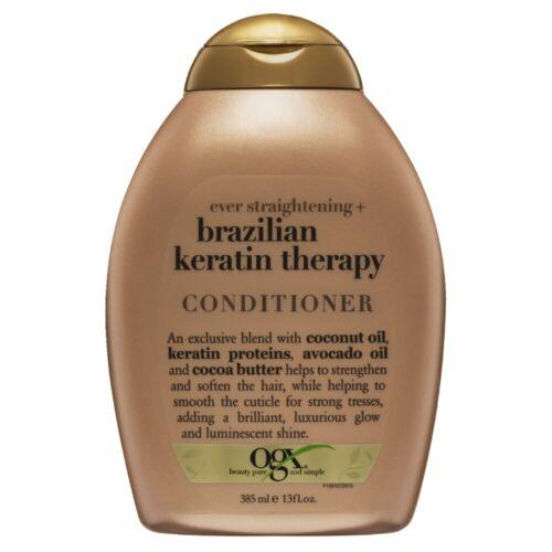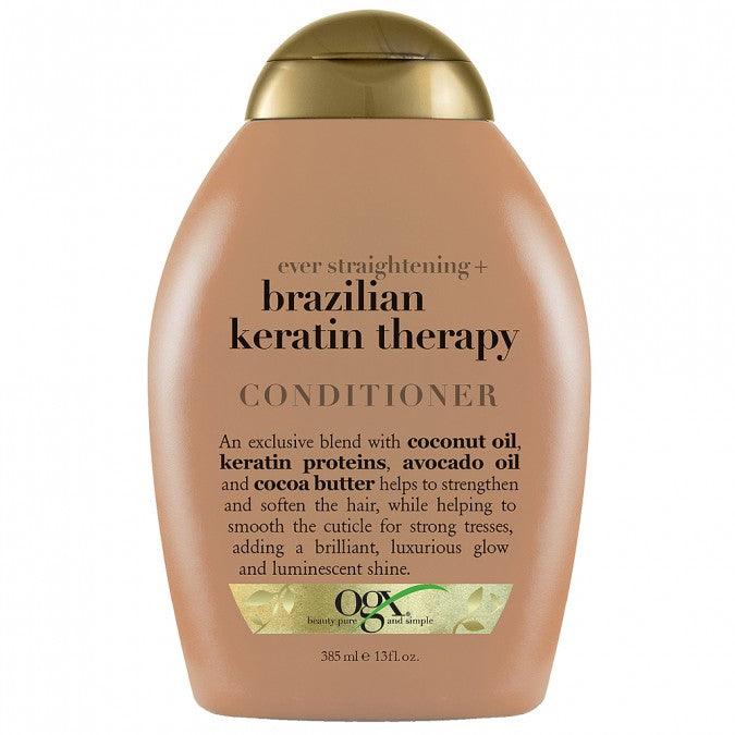 OGX Ever Straightening+ Brazilian Keratin Therapy Conditioner.Why You Want It... This rich sulfate free conditioner formula with Brazilian coconut oil and keratin proteins will help smooth and strengthen your curly or wavy hair.The smoothing conditioner features an exclusive blend of coconut oil, keratin proteins, avocado oil and cocoa butter to help strengthen and soften the hair, while helping to smooth the cuticle for strong tresses, adding a brilliant, luxurious glow and luminescent shine.Keratin conditioner strengthens and smooths hairStraightening formula is great for those looking to smooth wavy hair or maintain straight hairSulfate free surfactants, (sodium lauryl sulfate) SLS freeNot tested on animals Made in Thailand.