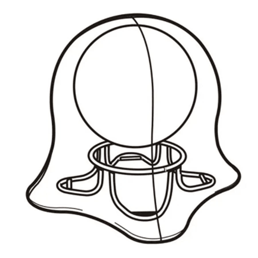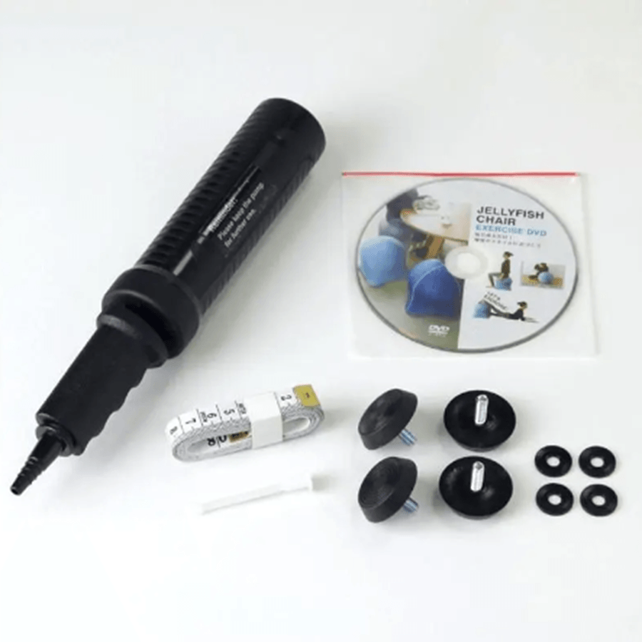 Once fully constructed, the chair consists of a steel frame surrounding an inflated balance ball which is covered by a stretchable fabric cover. The balance ball can be deflated and the chair deconstructed again for easy storage or transfer in the supplied packaging box.