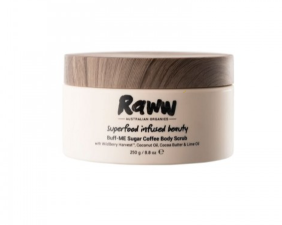 3. Step out of direct water and apply Raww Buff-ME Sugar Coffee Body Scrub in large, circular motions all over.