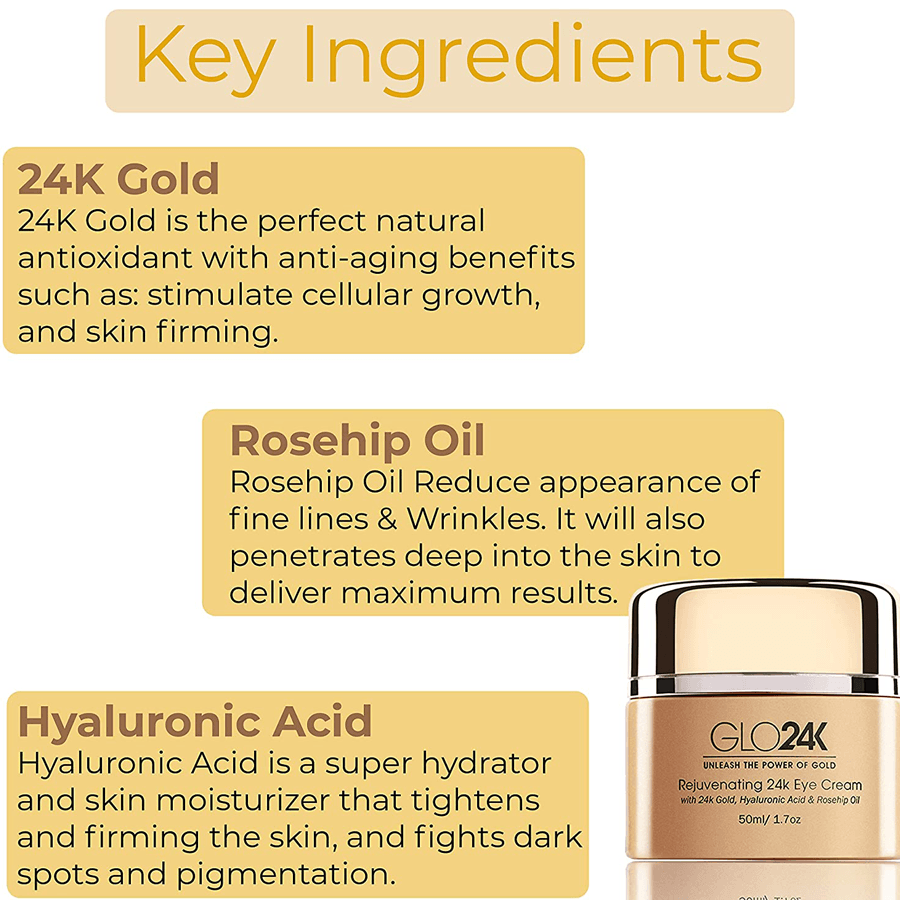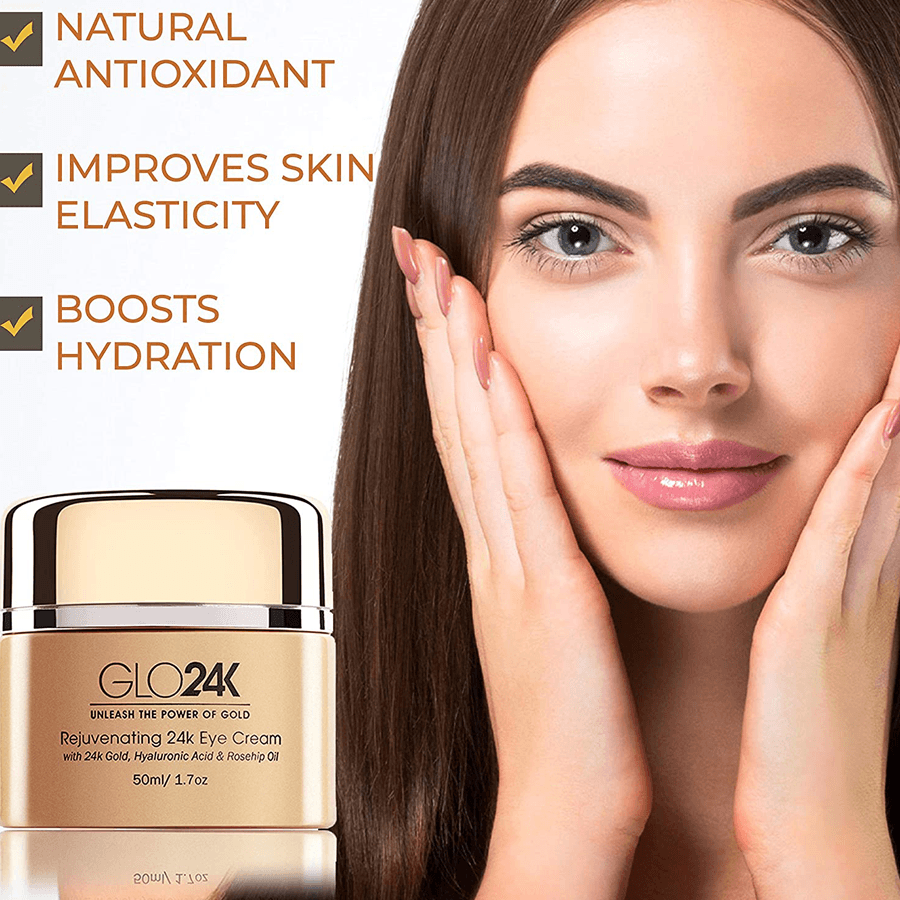 The GLO24K Rejuvenating 24k Gold Eye Cream is an anti-aging eye cream specifically designed to hydrate, revitalise and protect the delicate skin around the eye area enriched with Hyaluronic acid, Rosehip oil and 24k gold. This brightening eye cream reduces dark circles, wrinkles, fine lines, under-eye puffiness, and crow’s feet, leaving you looking rejuvenated and glowing. For best results use GLO24k Rejuvenating Eye Serum.