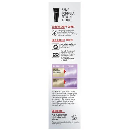 Schwarzkopf Live Colour Pastels Lilac Blush by Ultra Brights is a semi-permanent colour which stunning pastel tones in 2 minutes, provides a glossy vivid shine, contains no ammonia and is good for 8 washes.