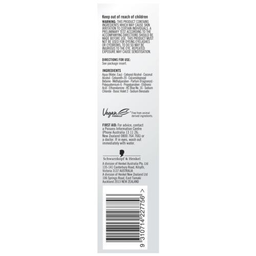 For advice, contact a Poisons Information Centre (Phone Australia 13 11 26; New Zealand 0800 764 766) or a doctor. If in eyes, wash out immediately with water.Ingredients Aqua(Water), Cetearyl Alcohol, Coconut Alcohol, Ceteareth-20, Disodium Cocoamphodipropionate, Methylparaben, Parfum, Polyquaternium-6, Propylparaben, HC Blue No. 16, Basic Violet 2, Ethanolamine, Etidronic Acid.Directions Quick & Easy to Apply: Shampoo and towel dry hair. Apply colour and leave on for 2 to 15 minutes. Rinse thoroughly and style as usual. We recommend using two packs or more if your hair is longer than chin length.One Application: Instruction leaflet & gloves enclosed. Directions for use: See package insert.