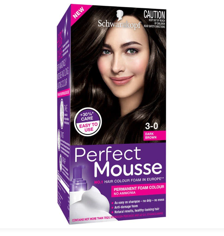 Schwarzkopf Perfect Mousse 3.0 Dark Brown is a rich, vibrant hair dye that delivers salon-quality color at home. This permanent mousse formulation allows for easy, even application and a beautiful, long-lasting dark brown shade. The mousse texture ensures it spreads evenly through your hair without drips, offering a mess-free coloring experience. It’s designed to provide natural-looking color with radiant shine, and it works well on all hair types, giving you full coverage, even for gray hair.