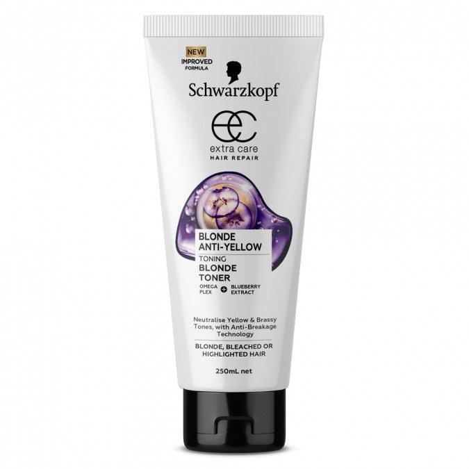Your blonde, bleached or highlighted hair can become subject to unwanted brassy and yellow tones and the hair can feel dry and damaged. It requires special care to neutralise these unwanted tones while repairing the hair for a cooler colour result and stronger hair.Extra Care Blonde Toner offers:ANTI-YELLOW TECHNOLOGY FOR NEUTRALISATION OF YELLOW & BRASSY TONESOMEGAPLEX ANTI-BREAKAGE TECHNOLOGY FOR STRONGER HAIRVISIBLY IMPROVED HAIR QUALITY WITH INTENSE SHINEExtra Care Blonde Toner contains ANTI-YELLOW TECHNOLOGY with intense violet pigments to revive and brighten gold, blonde and naturally grey hair for a cooler result.Made in Australia.100% Recyclable via TerraCycle. Visit TerraCycle.com for more details. Neutralises yellow and brassy tones, with Anti-Breakage Technology.EXTRA CARE formulas with LIQUID KERATIN, ADVANCED HAIR TECHNOLOGY & NATURAL ACTIVES help repair existing damage and provide protection with visibly improved hair quality.Extra Care Blonde Toner contains ANTI-YELLOW TECHNOLOGY with intense violet pigments to revive and brighten gold, blonde and naturally grey hair for a cooler result.