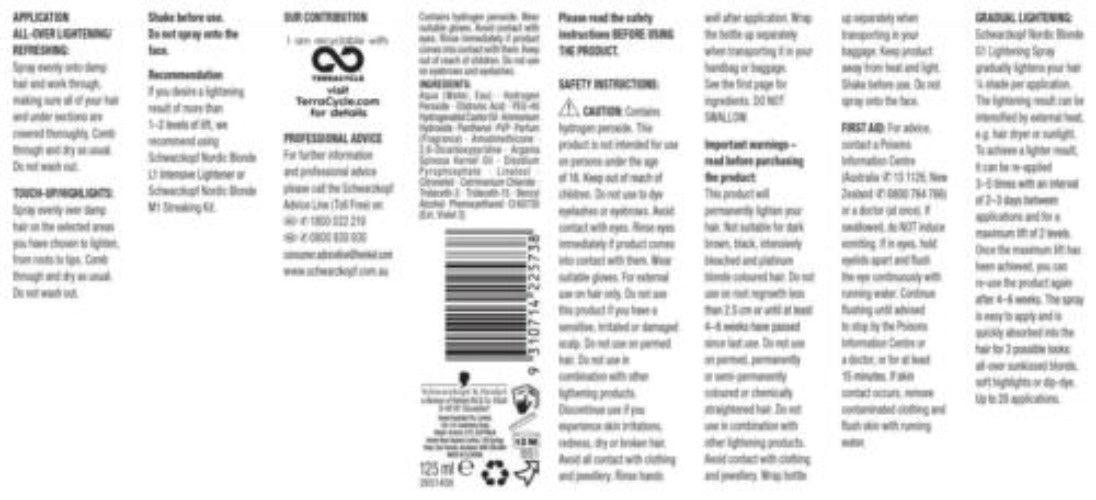 With the Schwarzkop Blonde Lightening Spray you can easily creaty soft sunny reflexes. With the unique formula your hair will become shade lighter with every application. The result can be instensified with heat. The lightening spray is easy to use and is quickly absorbed by the hair without having to wash it first. Use the spray for a step-by-step lightening of your complete hair, to touch up your roots or to create sunny highlights. The new formula comprises precious argan oil which nourishes the hair already during the lightening process. For naturally looking, lighter blond with soft sunny reflexes.