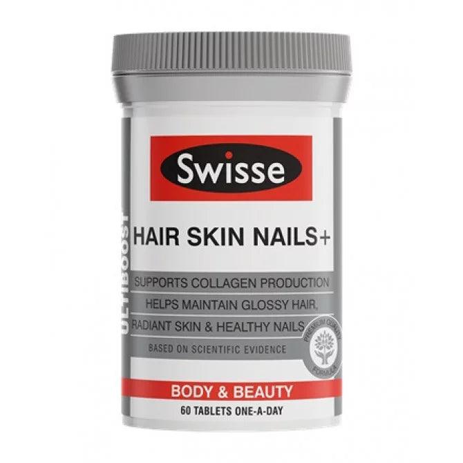 Swisse Ultiboost Hair Skin Nails+ is a premium quality beauty formula with vitamins and minerals specifically formulated to support collagen production and assist in the maintenance of glossy hair, radiant skin and healthy nails.