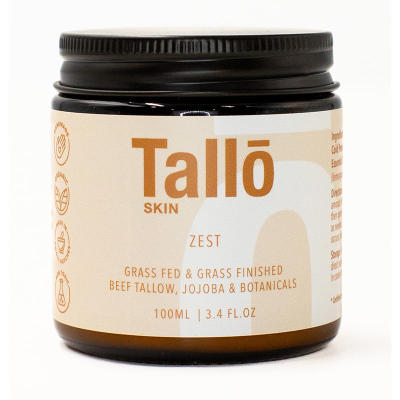 Experience deep, natural nourishment with Tallo Skin Organic Tallow Cream in a refreshing Zest scent. Handcrafted with 100% grass-fed beef tallow, this cream is rich in skin-loving vitamins A, D, E, and K. Its bio-available formula is designed to mimic the skin's natural oils, ensuring quick absorption without a greasy residue. Infused with organic lemon and sweet orange essential oils, it provides an uplifting aroma while effectively moisturizing the face and body, soothing irritation, and promoting a healthy, radiant complexion.
