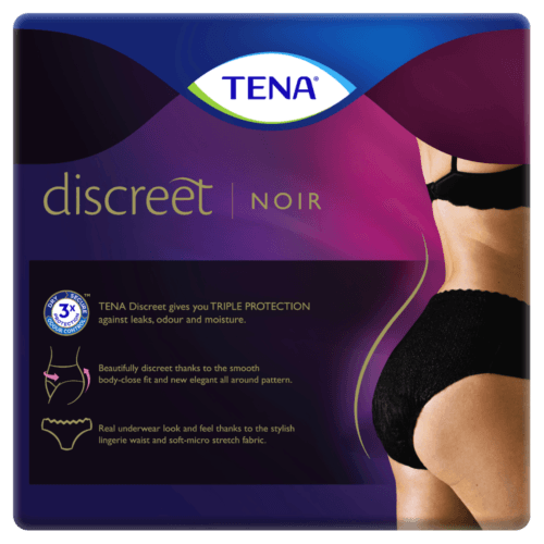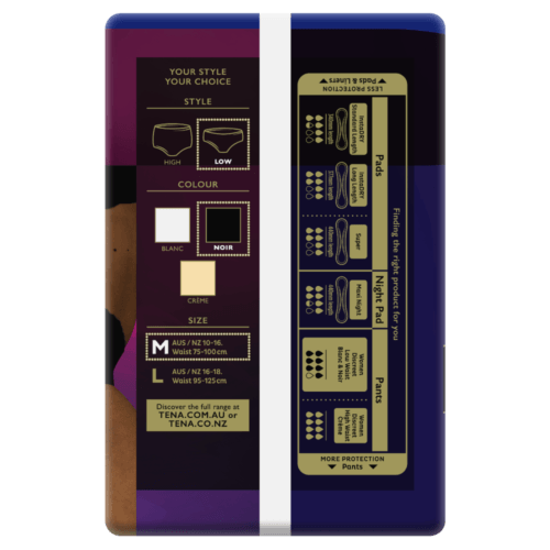 TENA Women’s Discreet Low Waist Noir incontinence underwear look and feel just like regular underwear but also give you discreet protection against moderate bladder weakness.